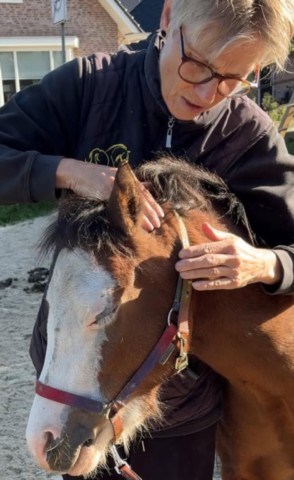 Spookie, een jonge pony, oogde de laatste tijd wat sloom en leek wat spanning in zijn lijf vast te houden. Kim had het gevoel dat er iets niet helemaal in balans was — hij hield zijn bovenlijn gespannen, schudde regelmatig met het hoofd en had weinig zin om uit zichzelf te lopen. Vaak moest ze hem echt meetrekken.